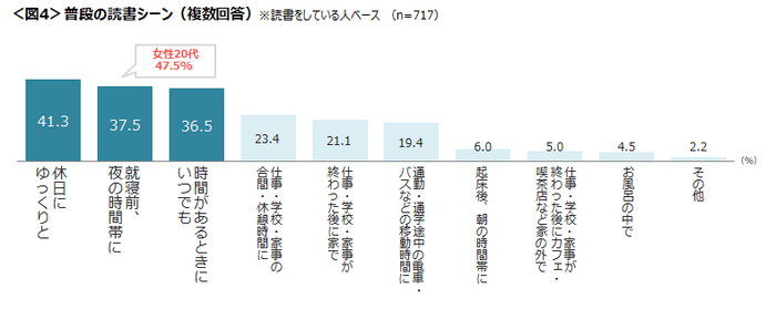 普段、読書をするシーンは、「休日にゆっくりと」が41%でトップ。次いで「就寝前、夜の時間帯に」「時間があるときにいつでも」が続く。