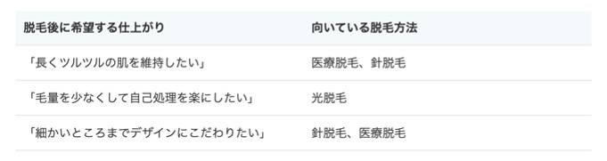以下に、3つの脱毛方法がそれぞれ向いている人をまとめました。