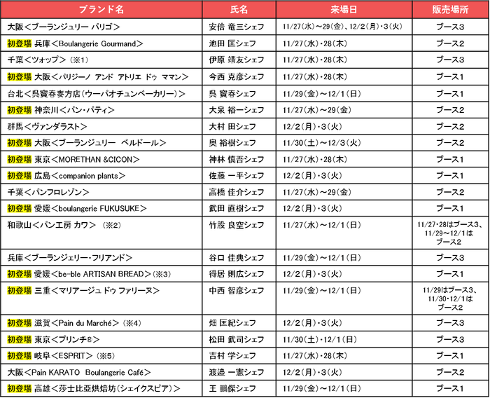 会場内の3つの製造ブースには、大阪で大人気の<ブーランジュリー パリゴ>の安倍竜三シェフを筆頭に、全国各地そして台湾から7日間で計21名のシェフ(うち13名が初登場)が来場し、会場でこだわりのパンを焼き上げます。2~3日で来場シェフが入れ替わるため、会期中何度来場しても新鮮なラインナップをお楽しみいただけます。
