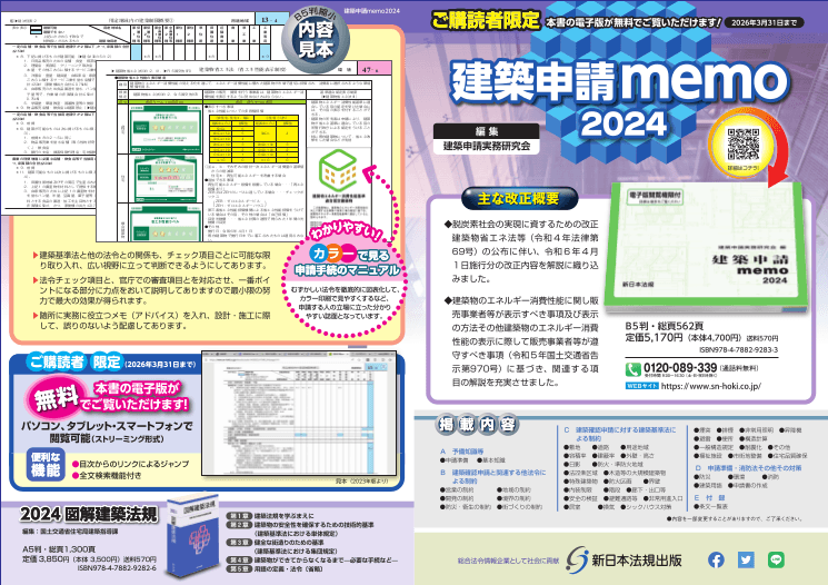 新日本法規出版株式会社(所在地:愛知県名古屋市中区栄1丁目23番20号、代表取締役:星謙一郎 (https://www.sn-hoki.co.jp/)は、「建築申請memo2024」を2024年2月7日に発売いたしました!