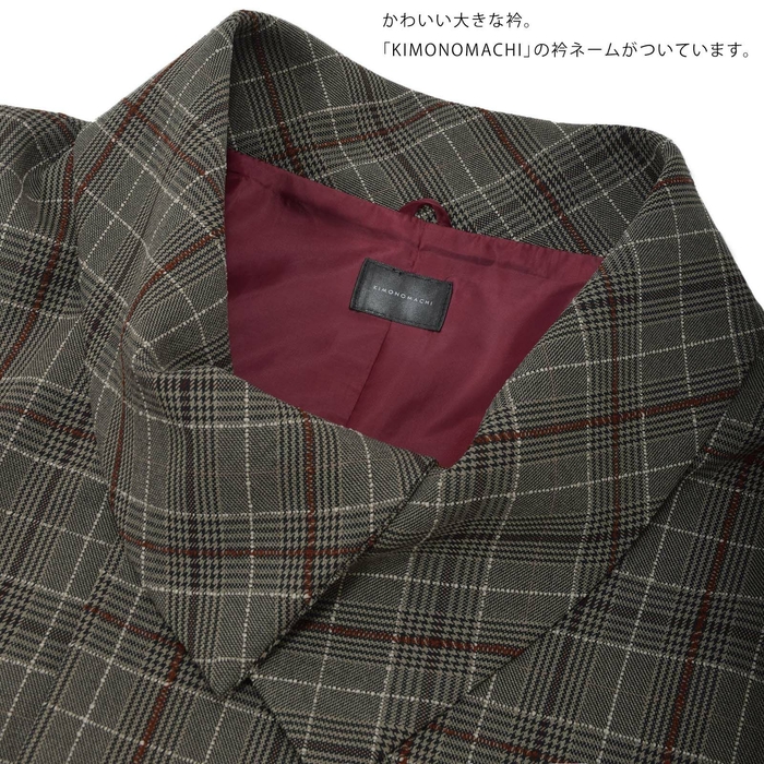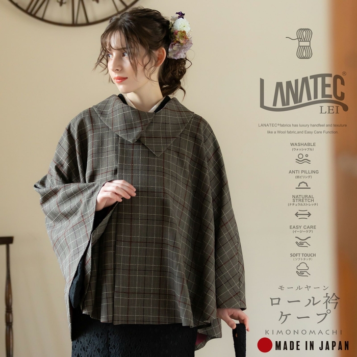 LANATEC LEIとは動物性繊維や石油系ドライクリーニングを必要としないエコな高機能ファブリックで、シワになりにくくて洗濯機で洗えるすぐれもの。素材はウールライク。やや薄手で軽く、やわらかなふくらみのある風合い。ピリング(毛玉)もできにくく、お手入れ簡単で肌触りのよい生地。モールヤーンを使用し、部分的に凹凸感のある表面感もポイント。柄はアッシュグレー×黒×ワイン色の複雑な色合いがウォールナットを想起させるクラシカルなチェック模様。着物はもちろん、洋服にもお洒落にコーディネートできるデザインとなっている。