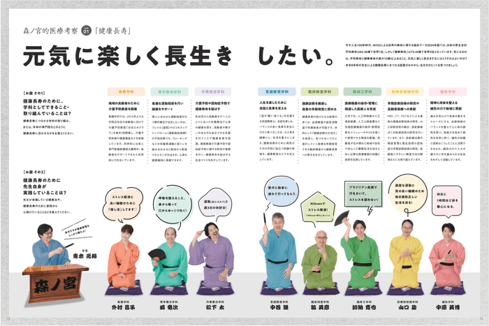 本学には8学科の資格だけでなく、医師や歯科医師、トレーナー等さまざまな資格を持つ教員が在籍しています。森ノ宮的医療考察「健康長寿」ページでは、8学科の学科長が「元気に楽しく長生きしたい」をテーマに、自身が実践していることを大喜利風に紹介。また、教員紹介「Like M」ページでは、「みんなの知らない先生のMな個性」と題し、森ノ宮医療大学の“M”にちなんで、教員が密かにハマっているものを紹介しました。普段、講義や実習でしか関わらない教員の意外な一面から、研究に取り組む姿勢やユニークな発想の源が見えてくるかもしれません。ぱっと見では分からないたくさんの「想い」を持った森ノ宮医療大学教員の人間力を是非ご覧ください。