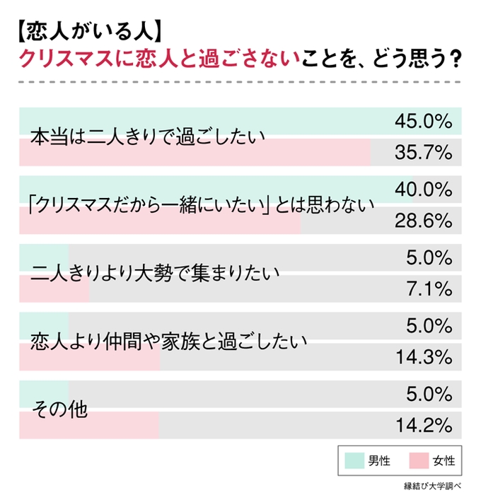 男性に比べて、女性の方が“恋人がいてもクリスマスに二人きりで過ごさない”という人が多い結果となりました。