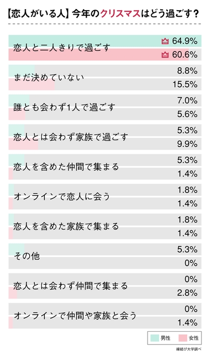恋人がいる人のうち、クリスマスを「恋人と二人きりで過ごす」のは男性が64.9%、女性が60.6%と約6割です。次に多かったのは、男女とも「まだ決めていない」という回答でした。