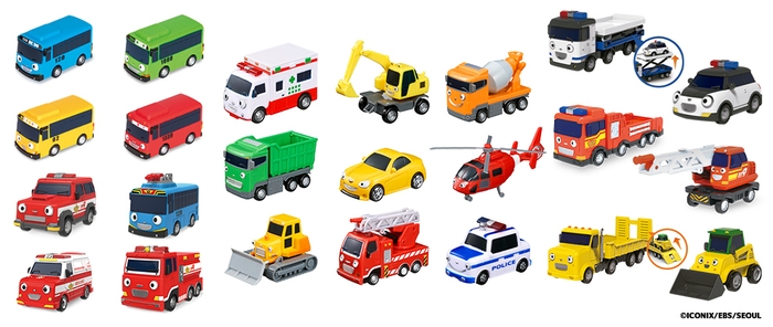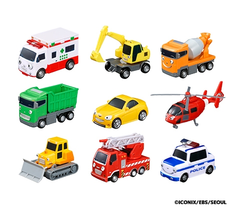 バスをモチーフとした主人公のタヨをはじめとして、パトカーや消防車などアニメの中で活躍する乗り物のミニカーが20種以上登場します。