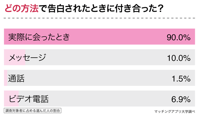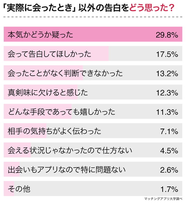 反対に「どんな手段であっても嬉しかった(11.3%)」「相手の気持ちがよく伝わった(7.1%)」「会える状況じゃなかったので仕方ない(4.5%)」「出会いもアプリなので特に問題ない(2.6%)」と、会う以外の方法で告白されても別段問題ないと感じた女性は合計25.5%でした。