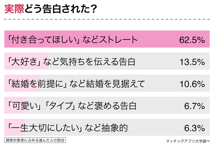 「マッチングアプリで出会った男性から実際どう告白されましたか?」と聞いたところ、1位は「”付き合ってほしい”などストレート(62.5%)」、2位は「”大好き”など気持ちを伝える告白(13.5%)」でした。