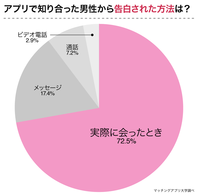 「マッチングアプリで知り合った男性に告白された方法は?」と聞いたところ、1位は72.5%で「実際に会ったとき」でした。2位は「(アプリ内の)メッセージ(17.4%)」、3位は「通話(7.2%)」、4位は「ビデオ電話(2.9%)」という結果です。