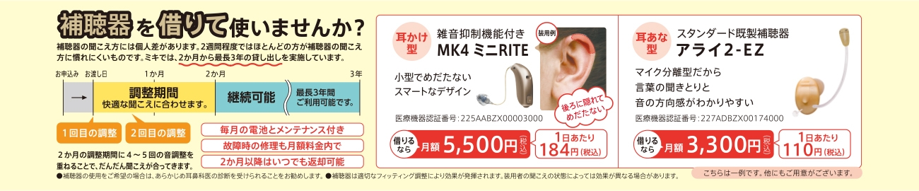 月額税込3,300円~ 定額にて補聴器を貸し出しいたします。使えるようになるか不安な方は、まずは補聴器を借りることから始めてみませんか?