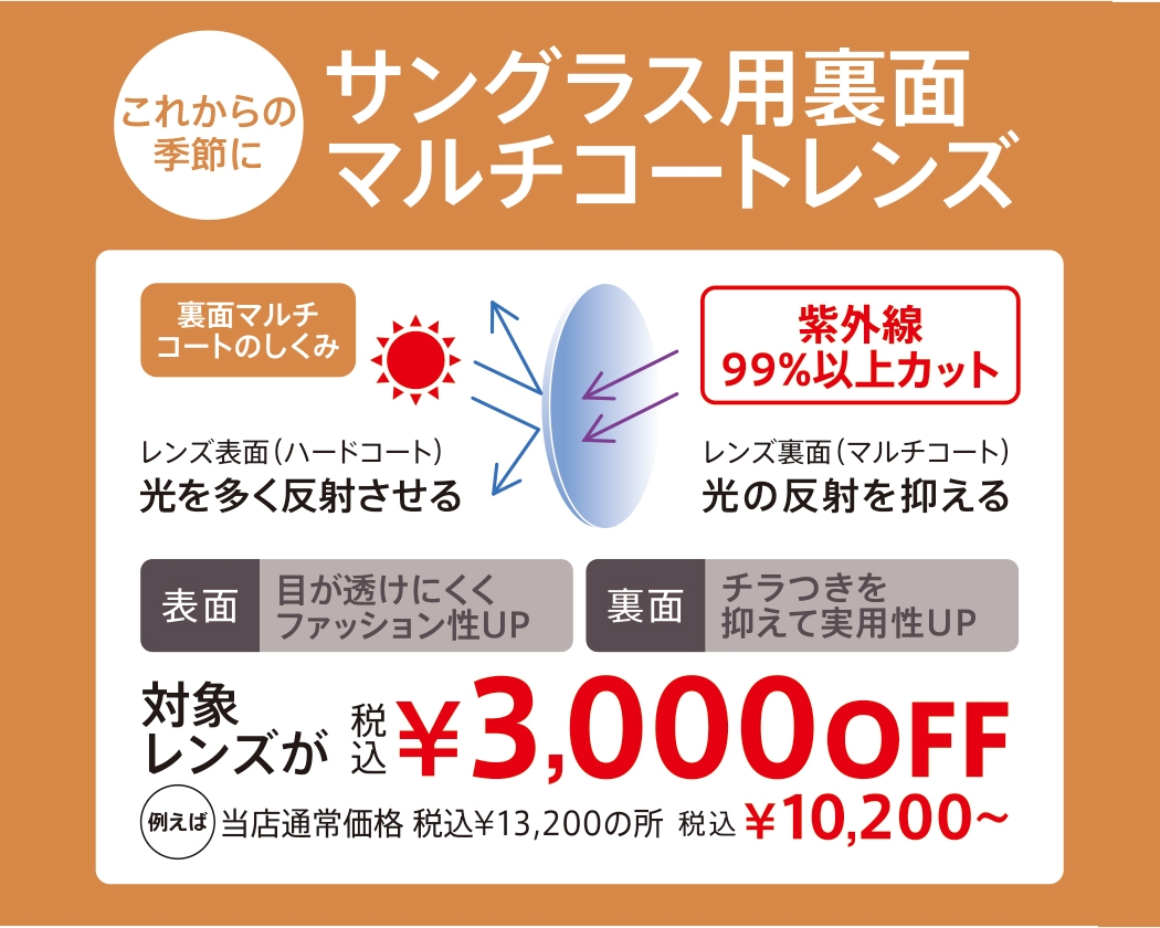 これからの季節に、サングラス用裏面マルチコートレンズがオススメ!裏面のマルチコートがチラつきを抑えて実用性をUP、表面は目が透けにくく、ファッション性がUPします。