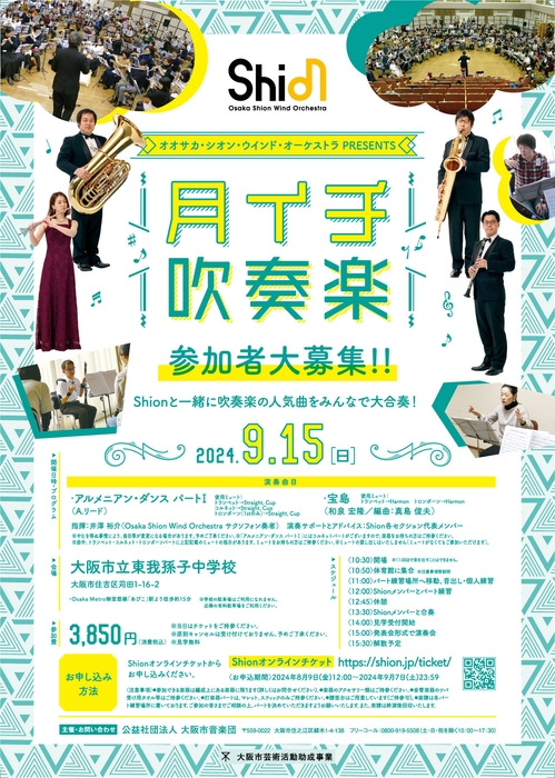 日本で最も長い歴史と伝統を誇る交響吹奏楽団のOsaka Shion Wind Orchestraを有する公益社団法人 大阪市音楽団(本社:大阪市住之江区/理事長:石井徹哉)は、月に一度、楽器を持っている方が集まって、Shionメンバーと一緒に吹奏楽曲を演奏できる人気イベント「月イチ吹奏楽」を2024年9月15日(日)に開催いたします。