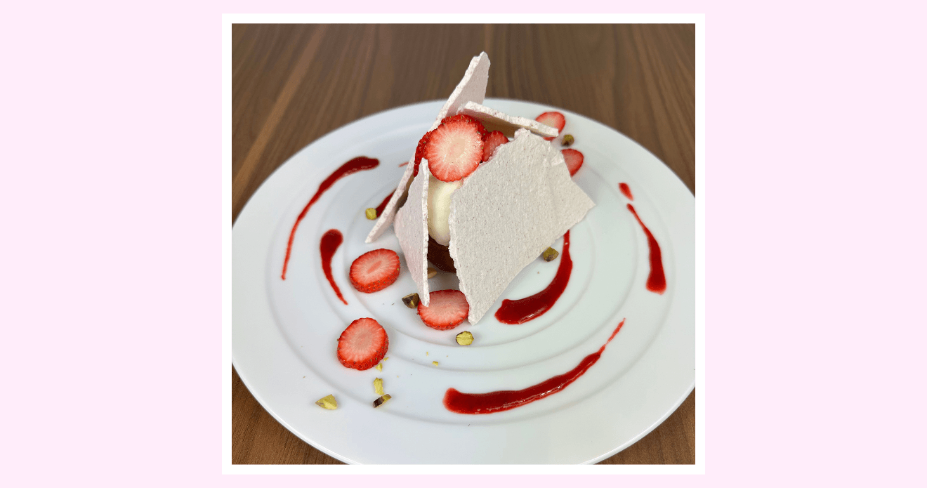 滑らかなフランと苺ソース、バニラアイスにメレンゲの雪山、ピスタチオの花々で冬から春への季節を表現した一皿です。
