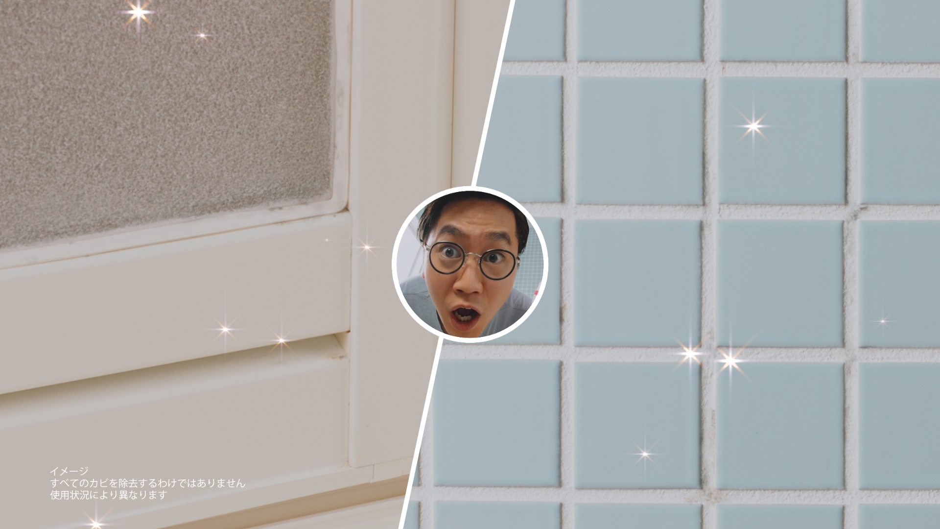 ジェルがカビに浸透していくイメージカット。黒カビに怯える夫。「ウルトラハードクリーナー カビ用」が浸透して、カビを破壊。その破壊力に驚く夫。綺麗になった浴室にうっとりする夫婦。