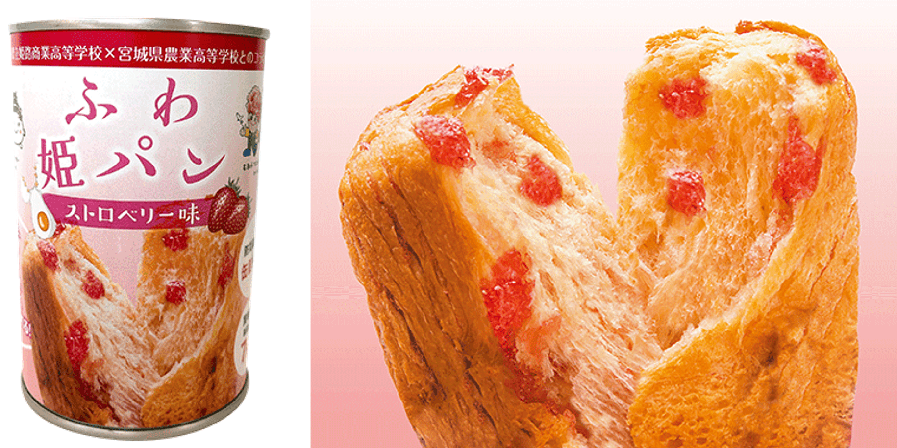 阪神淡路大震災の被災地である兵庫県立姫路商業高等学校と、東日本大震災の被災地である宮城県農業高等学校が連携して災害備蓄用の缶詰パンを開発。「どこでも・誰でも・手軽に・そのまま・美味しく」食べられる、5つのコンセプトを取り入れた災害食。4つのエシカル消費(地産地消・被災地支援・食品ロス削減・ゴミ削減)に基づき、食材には豊かなコクと味わいが特徴である兵庫県産の卵と、糖度が高くてほどよい酸味が特徴である宮城県産の苺を使用。風味豊かで食べやすい食感に仕上げた逸品です。