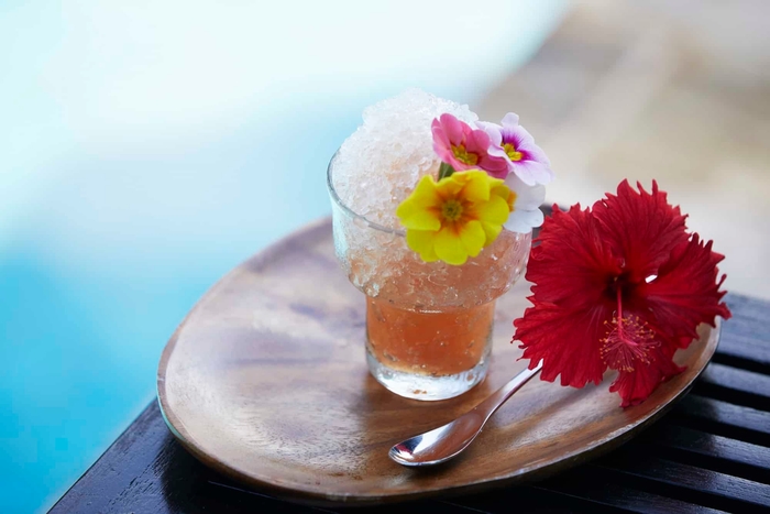 海を臨む「BOOKS&CAFE」では、島で親しまれているフルーツのひとつ、グアバを使用したオリジナルかき氷を提供します。甘酸っぱい味わいのグアバを使ったかき氷に、エディブルフラワーを添えた見た目もかわいい「お花かき氷」です。オーシャンフロントの特等席で、ひんやりスイーツを食べながら、くつろげます。