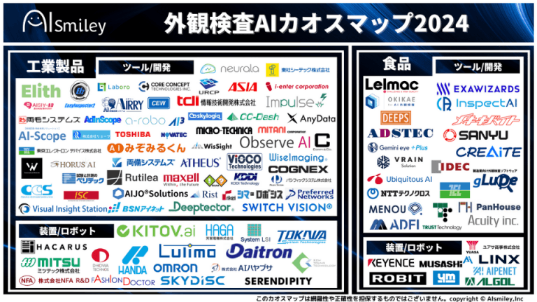 外観検査AIカオスマップは、外観検査AIを「工業製品」や「食品」など用途別に分類、マッピングしております。作成にあたり参考にしたサービスURL、ベンダーを記載した一覧表(Excel)は、カオスマップ資料請求後に、外観検査AIの導入を検討している企業ご担当者様に無償でご案内いたします。