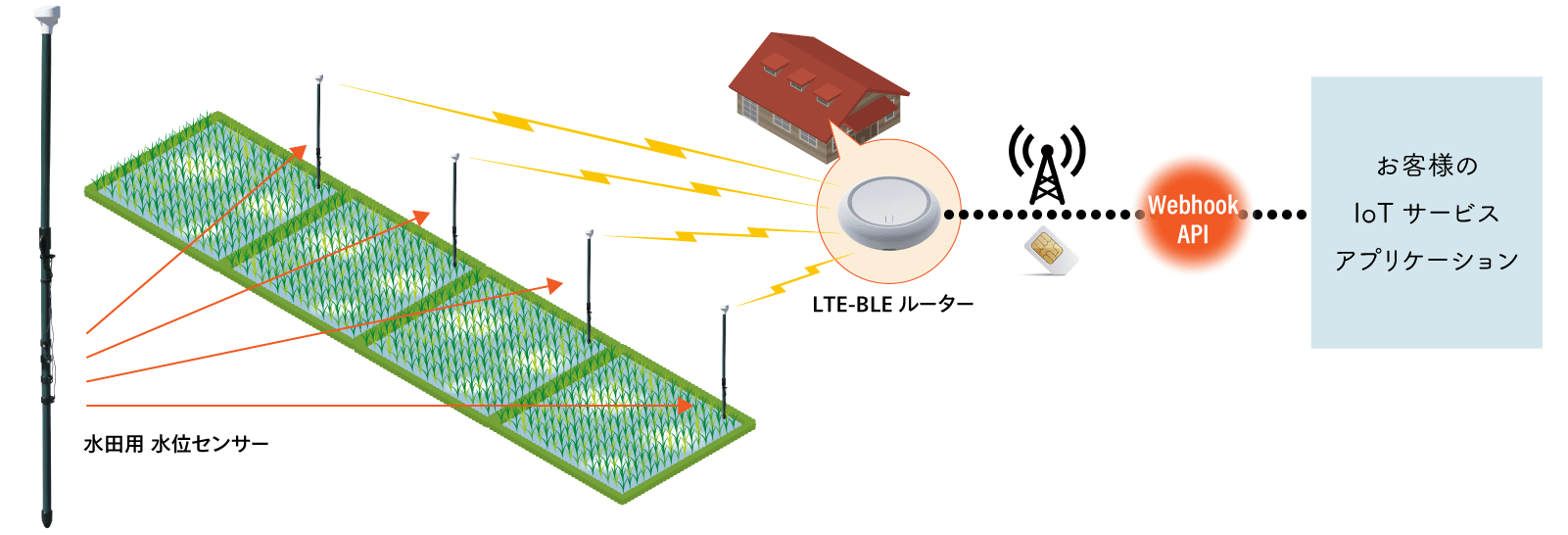多数の設置を可能とするリーズナブルな本体価格を実現。また、複数の『水田用 水位センサー』のデータを、水田周辺に設置した1台のLTE-BLEルーター(LongRange対応)で取得することができるため、ランニングコストも抑えることができます。