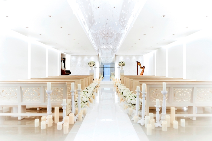 贅を尽くしたグランドフロアのバーカウンターを抜けて進み、チャペルの扉を開いた瞬間に飛び込んでくるのは、大理石でできた純白のバージンロード。その上で煌めく無数のクリスタルは、ふたりがこれまでの人生で出会った大切な人たちを表しています。