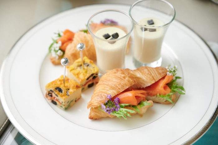 サムシングブルーとはヨーロッパにおける結婚式の伝統的な4つのおまじない“サムシングフォー”の1つで、しあわせを呼ぶ色とされる“青色”をテーマに取り入れました。ティアラやパール、ダイヤモンド、リボンなど、“結婚式”にまつわるアイテムを取り入れたブルーベースの上品なスイーツと、色とりどりの花畑を彷彿させる華やかな軽食プレートを、紅茶やコーヒーのフリーフローとともにご堪能いただけます。