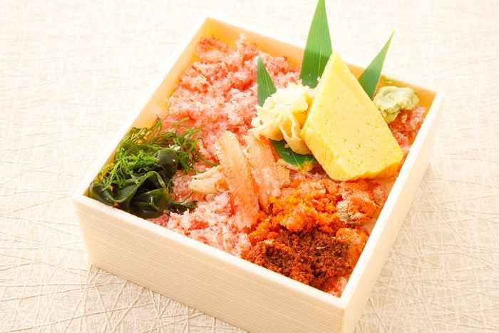福井県では24年3月に開通する北陸新幹線福井駅記念弁当と題し、セイコ蟹の内子・外子を散らしカニ棒肉をのせた福結びの越前カニ弁当を。