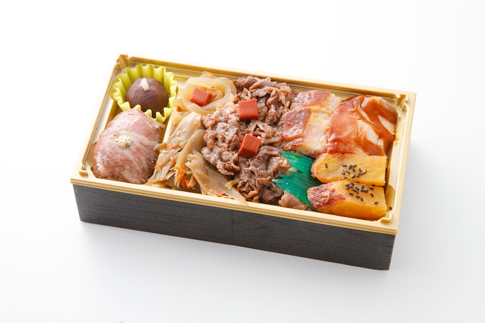 滋賀県立長浜農業高校とのコラボ弁当。高校生が栽培した玉ねぎと近江牛のすき焼きや大学芋、高校生が考えた永源寺こんにゃく入りきんぴらごうぼうなど滋賀のうまいもんを集めた限定弁当。