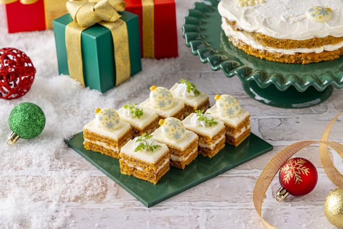 スポンジを敷いたレアチーズケーキに、生クリームとスポンジクラムを重ね、星、ヒイラギ、キャンディケインのチョコレートを飾りました。思わずたくさん手に取りたくなるようなワクワク感を楽しめるスコップケーキです。