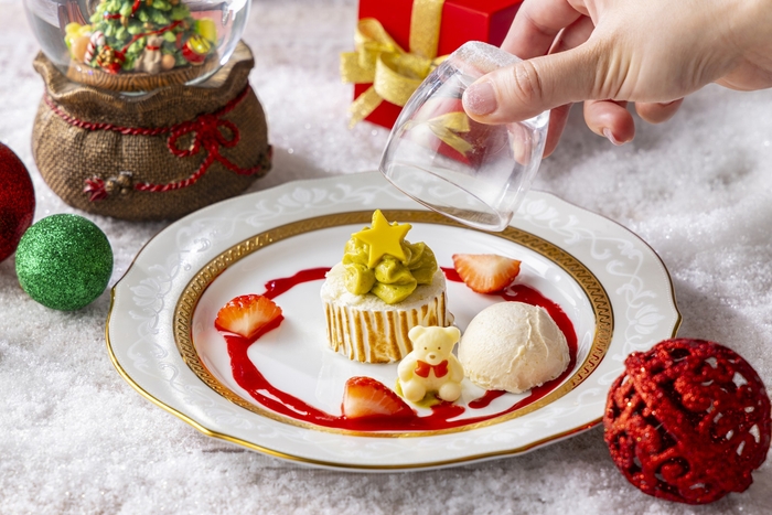 スノードームに見立てたライブステーションのスイーツは、グラスの蓋を開けるとピスタチオクリームのロールケーキが。ロールケーキはバーナーで炙り、切り株を模したデザインに。上にはクリスマスツリーのようなピスタチオクリームと星型のチョコレートを飾り、写真映えもする一品に仕上げました。横に添えたバニラアイスやフレッシュの苺ととともにコクのある「スノードームのピスタチオロールケーキ」をご堪能ください。