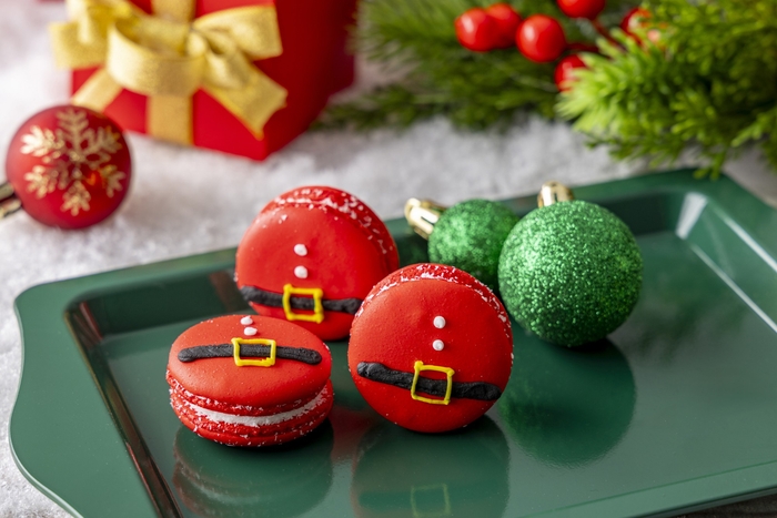 サンタさんの洋服に見立てた真っ赤なマカロン生地に、ラズベリーのバタークリームをサンドしました。ココナッツファインを側面に付けて、洋服のファーを表現しました。