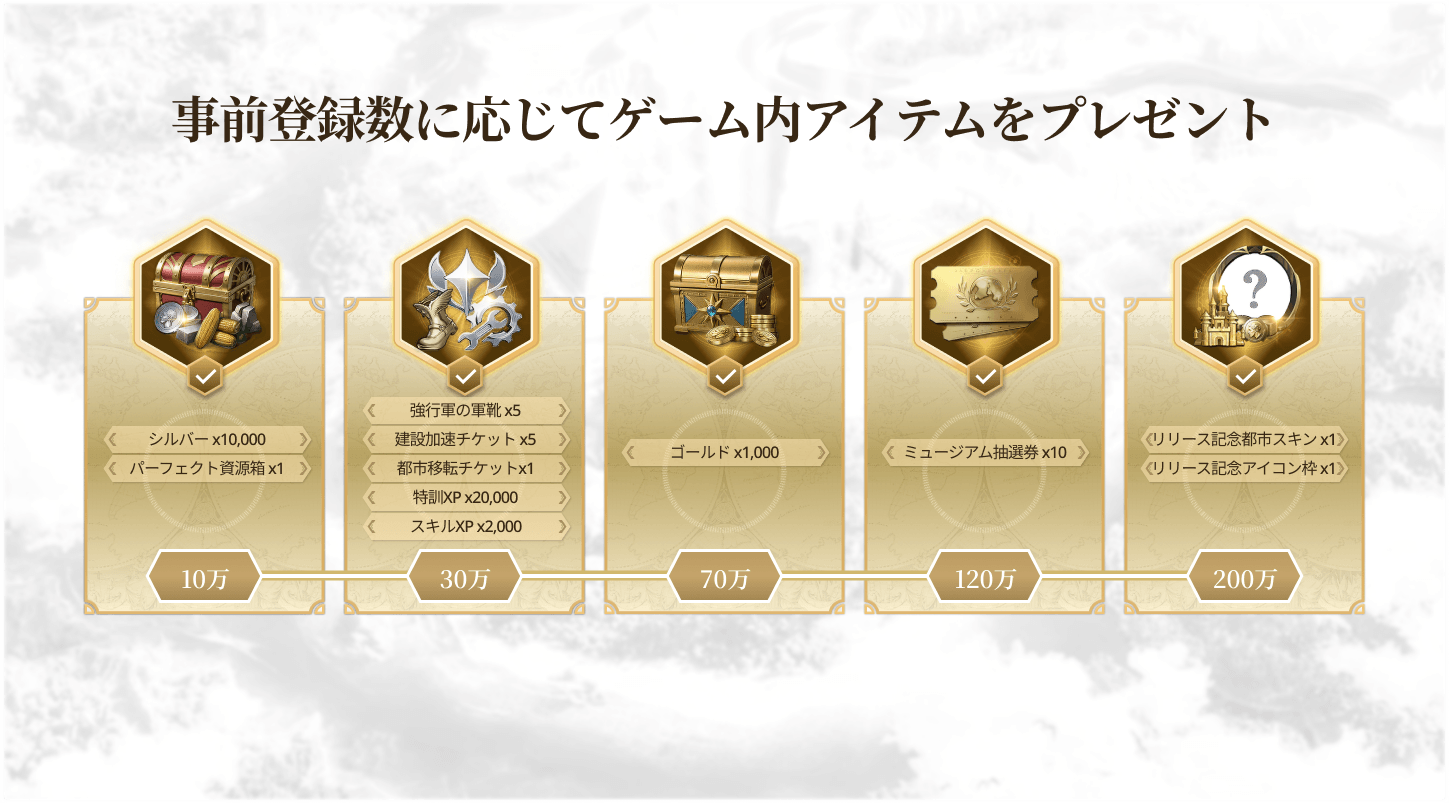 事前登録者が200万人を突破したことに伴い、英傑の採用などに使えるゴールドをはじめ、計11種類のゲーム内アイテムがリリース開始に合わせて全プレイヤーにプレゼントします。