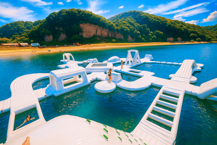 透明度抜群の日本海に浮かぶ海上アスレチックは、飛んで・滑って・登って、まるで海の上のテーマパーク!