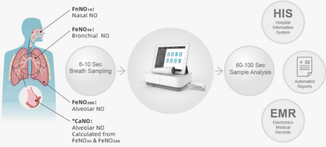 FeNO呼気分析装置とは、ヒトの呼気中に含まれる一酸化窒素(NO:Nitric Oxide)の濃度を測定する医療用機器であり、主に気道炎症の評価や喘息の診断・治療効果のモニタリングに用いられる。FeNO(Fractional exhaled Nitric Oxide)は、気道上皮細胞が炎症刺激によって産生するNOの一種であり、その濃度は気道炎症の存在や程度と相関があるとされる。特に好酸球性炎症を伴う喘息患者において、FeNO測定は非侵襲的かつ迅速なバイオマーカーとして注目されており、スパイロメトリーや血液検査などと並ぶ呼吸器疾患管理の補助的手法である。装置自体は携帯型から据置型まで存在し、診療所、病院、研究施設、さらには遠隔医療の現場でも活用されている。
