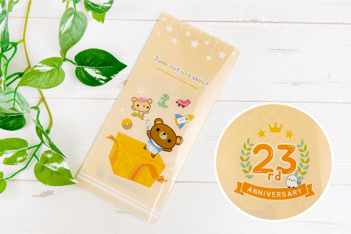 シールDEネームのコラム「いつDEもママらぶ」で登場するオリジナルキャラクターを入れた、23周年記念のために作られたオリジナルデザインです。少し幼い時期の姉弟のクマセとクマッタがプレゼントから飛び出してくるイラストと、裏面には23周年が印刷されています。お子さまから保護者さままでお使いいただけるデザインに仕上げました。