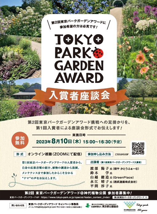 第2回東京パークガーデンアワード@神代植物公園の開催に伴い、第1回の入賞者による座談会を行います。応募書類の紹介や植物の調達から造園、代々木公園でのガーデン制作の様子など第2回のご参加を検討いただいている方へのヒントとなる話題もお届け予定です。オンラインでの配信なので、お気軽にご参加ください。入賞者の“ナマ”の声を無料で聴けるこの機会をぜひお見逃しなく!!!