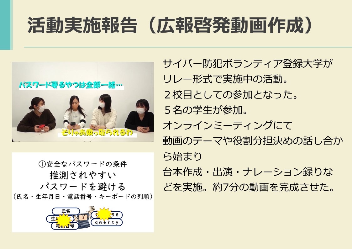 計6府県7団体から、それぞれサイバー防犯ボランティア活動状況の発表があり、本学は大阪代表として、「大阪府内小学校に対する防犯教室の実施(リモート・対面)と防犯啓発リレー動画について」約10分間発表。