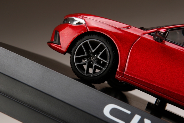 ハニカムメッシュのフロントグリルからインテーク、スタイリッシュにデザインされたインテリア、安全運転支援システム用のセンサー、テールランプなど細部にいたるまで再現しました。他にもマフラーはメッキ仕上げ、ホイールは金属の削り出しを塗装で再現するなど質感や色にもこだわった作りになっています。また、ダイキャストならではの質感と重量感も実感していただけます。