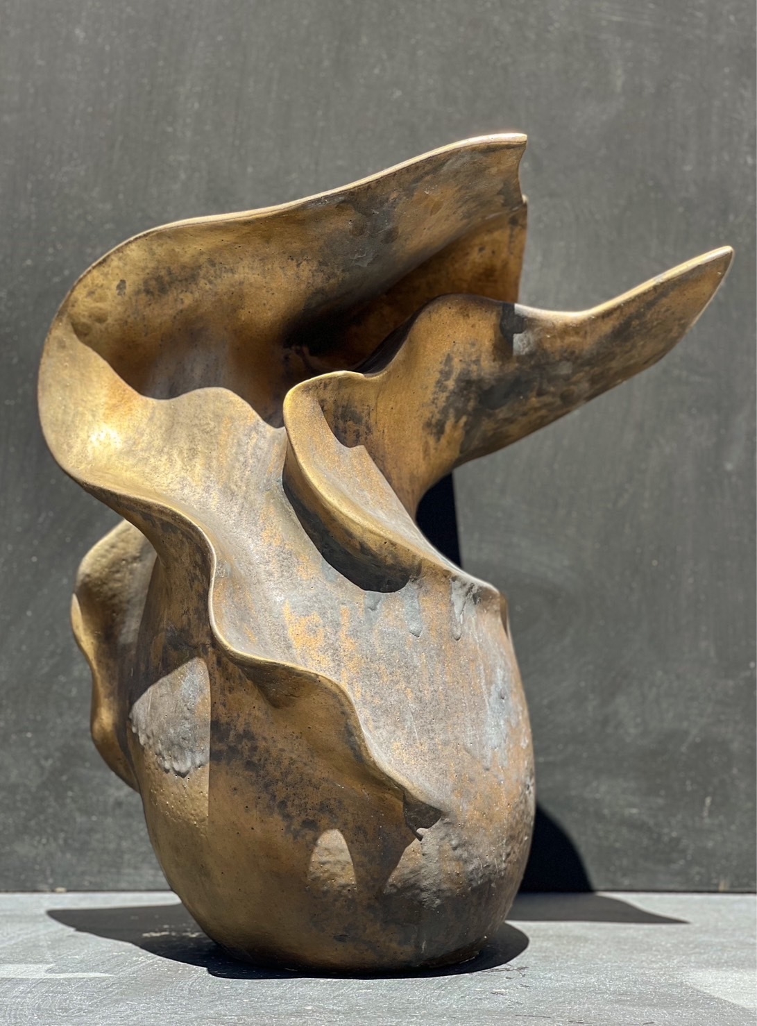 吉住優月さんの作品「Drape(ドレープ)」は、どの角度から見ても楽しめるよう、全面にドレープを施した作品です。釉薬には金メタリックを使用し、ドレープのヒラヒラの良さを出す為に、作品全体を光らすのではなく、スポットライトに当る箇所を中心に磨きました。
