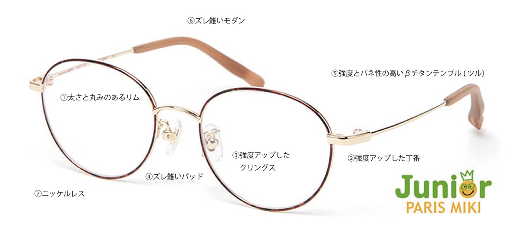 元気な子どもたちに必要な安全で快適な「子どもに特化したメガネ」の実現のため、7つの機能と設計により強度アップとフィット感を向上させました。人体適合も高いチタンやβチタンをベースに、メッキはアレルギーが起こりにくいノンニッケル仕様で安心と安全を実現しました。また、視力矯正に大切なずれにくさを実現させるために、シリコンパッド、クッション機能のある独自設計モダンを採用し、よりしっかりフィットするように仕上げました。