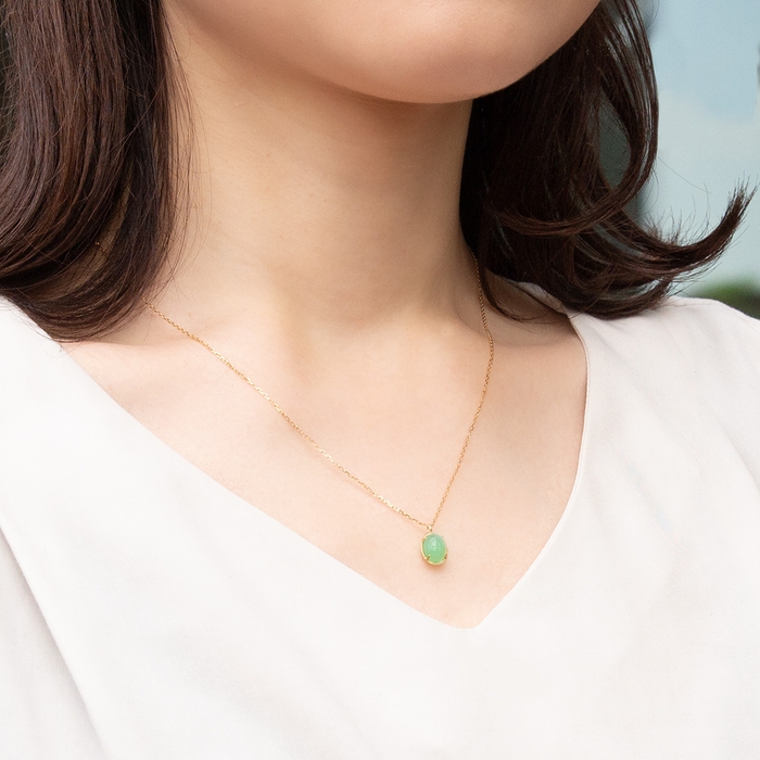つるりとしたカボションカットのチャームが可愛らしく胸元を彩る