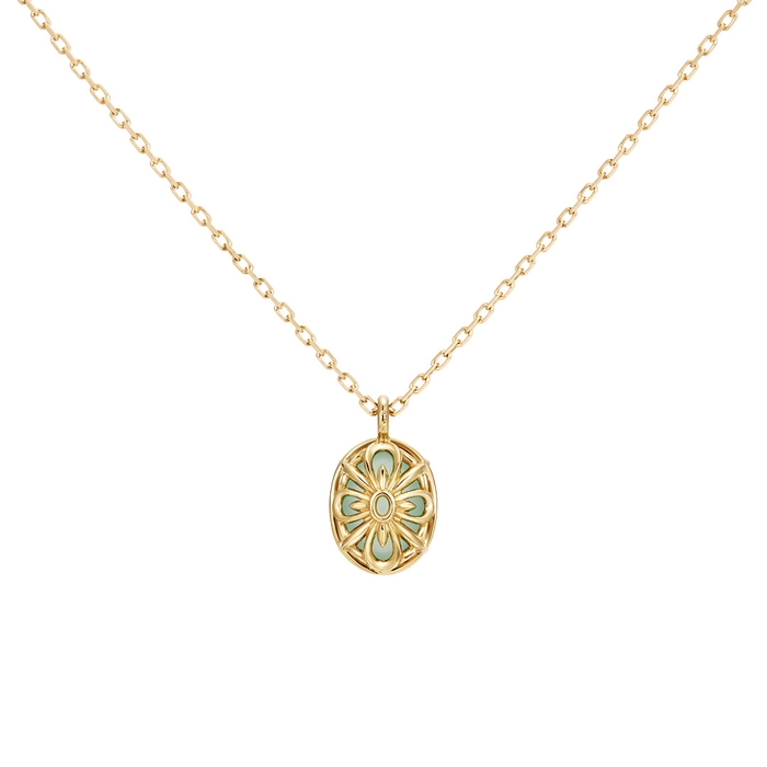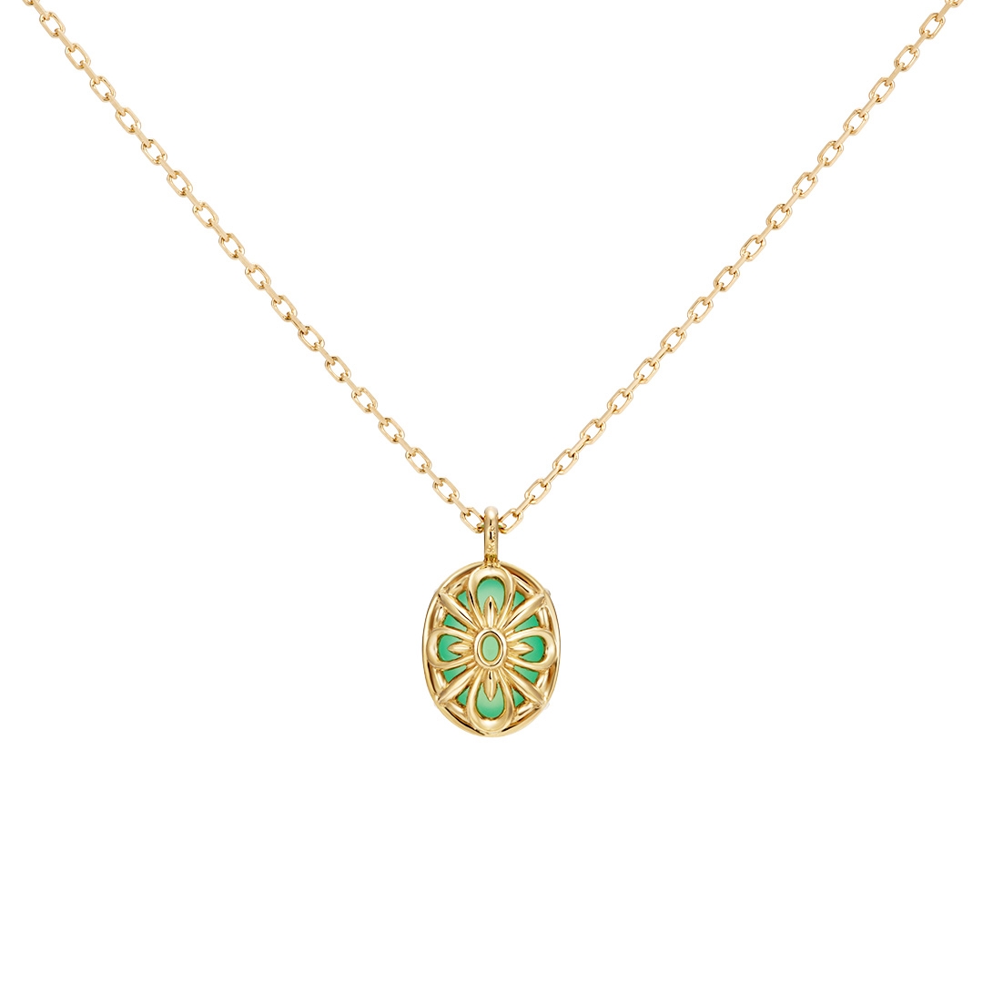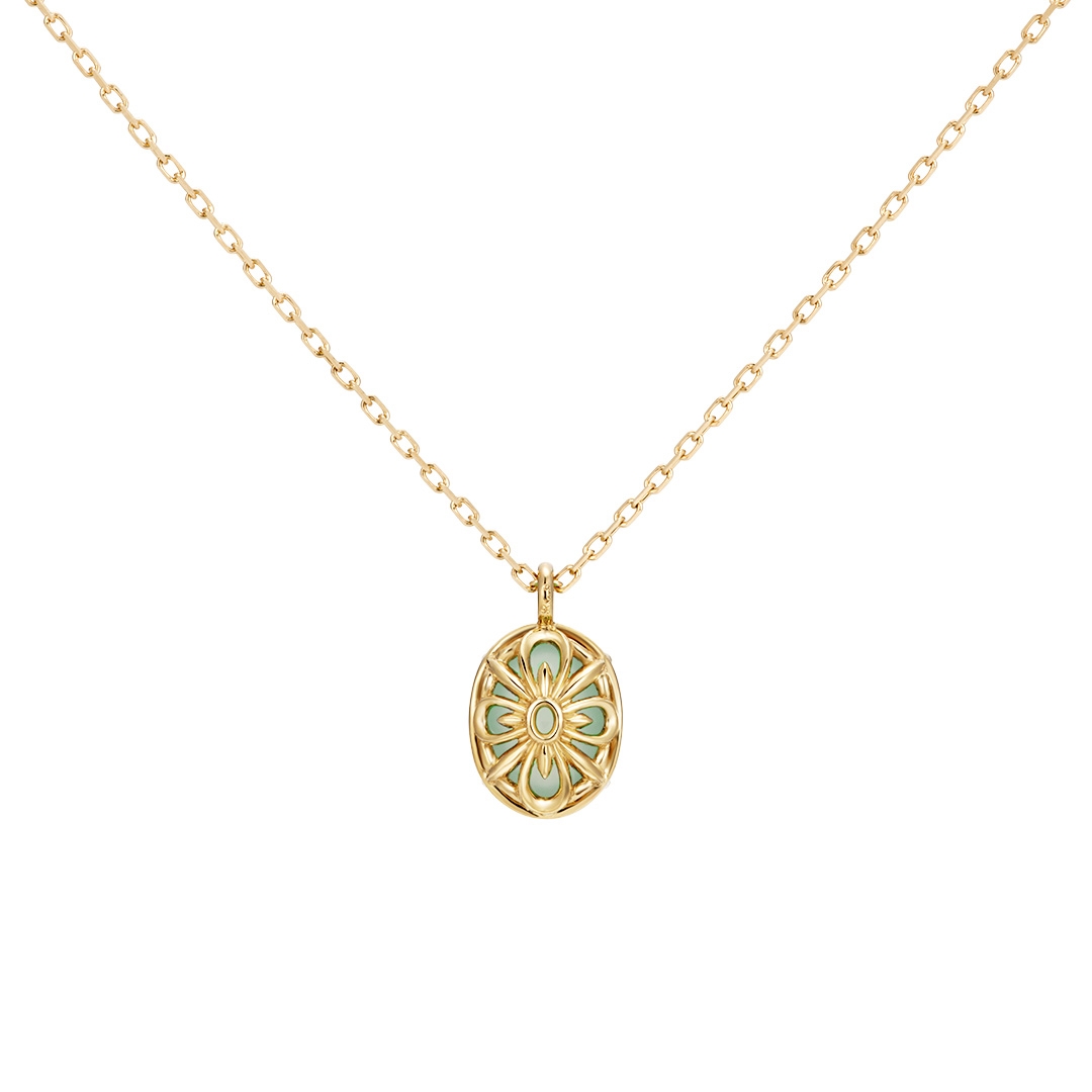 このほどの新作は、ファッションジュエリー「Fiorello(フィオレロ)」シリーズから登場し、トレンドカラーの天然石でグリーン系「クリソプレーズ」と、ブルー系「シーブルーカルセドニー」、つるりとしたカボションカットのチャームが可愛らしいネックレスです。カラーストーンの裏側は、まるで小さな花がそっと咲くような繊細な模様を施しています。コーディネイトに合わせて、どちらの面も表にできるリバーシブル仕様です。