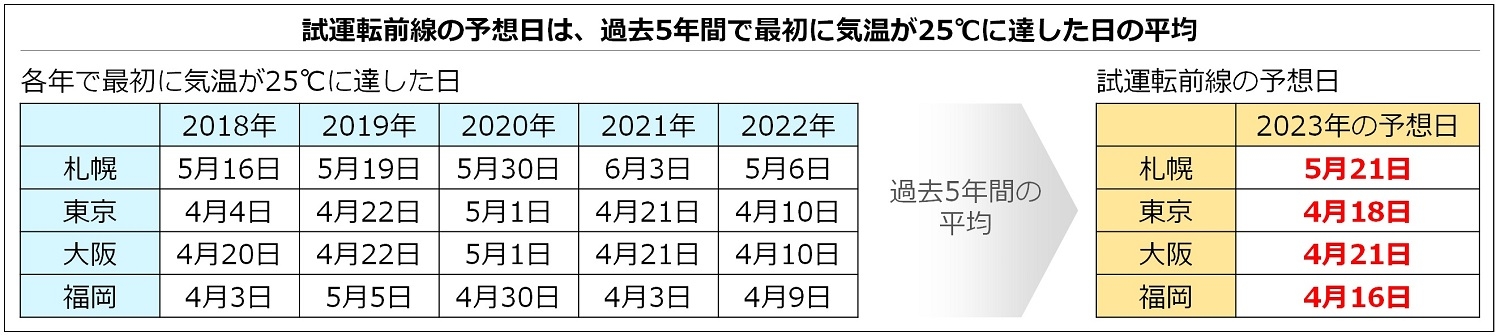 本前線に記載の予想日は、全国の各地域の過去5年間において、各年の最高気温が25℃に達した最初の日を調査し、それらを平均した日としています。