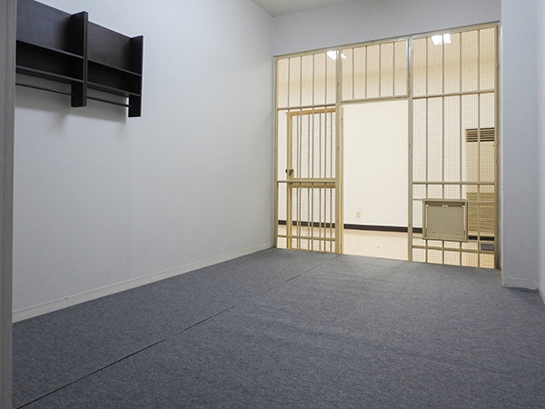 裁判所を再現した法廷セットでは、移動可能な全18席の傍聴席やテレビモニターと卓上マイクをご用意。法服の貸し出しもございますので急な撮影や急を要する事件の再現などにも対応が可能です。留置場は2部屋あり、鉄格子には配膳や物の受け渡しに使用する食器口、取り外し可能な金網や洗面台、トイレ、備品として和布団一式も取り揃えており、細かい描写、シチュエーションに対応が可能となっています。刑事ドラマには欠かせない取調室、面会室も合わせてご利用いただけます。留置場と面会室は窓外に通路を設けておりますので、窓側からの撮影や照明を設置することも可能です。