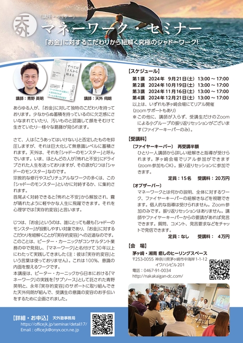 天外塾事務局(所在地:神奈川県茅ヶ崎市、代表:岡)は、「お金」に対するこだわりからひも解く究極のシャドーワーク・セミナー「マネーワーク2024」を全4講、神奈川県茅ケ崎会場とZoomにて開講します。また、各セミナー終了後には、録画配信も予定しております。