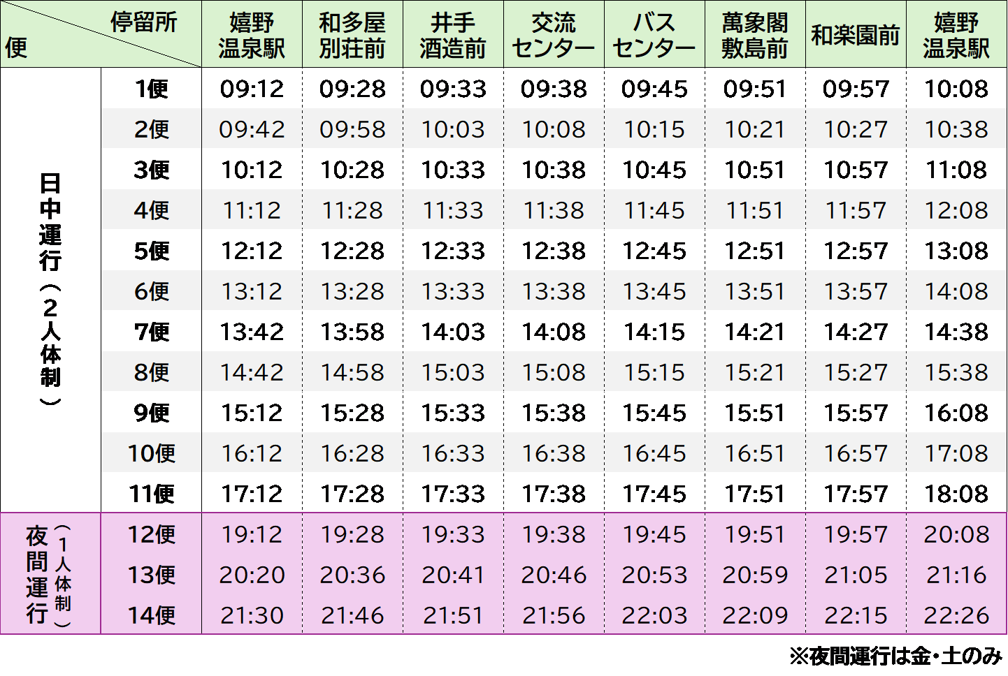 ※運行期間中の金曜日と土曜日は日中(11便)に加えて夜間便(3便)を運行