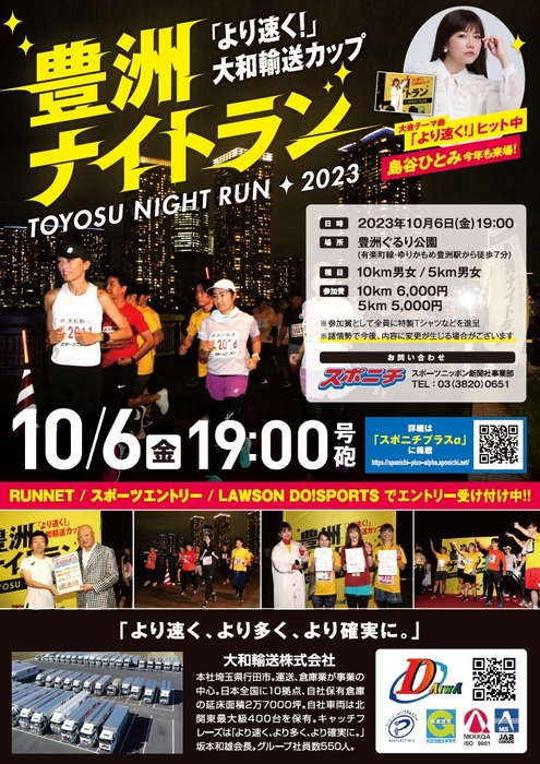 スポーツニッポン新聞社は、東京・豊洲を舞台にしたランニングイベント「より速く!大和輸送カップ豊洲ナイトラン」を10月6日(金)に開催します。