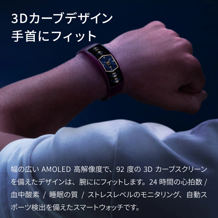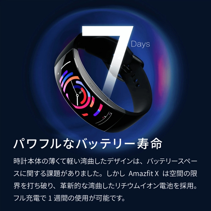 超ワイドなAMOLED高精細3Dカーブスクリーンを採用した「Amazfit X」が登場!連続24時間の心拍数および血中酸素モニタリング、睡眠の質、ストレスレベルのモニタリング、および自動スポーツ検知機能を搭載した「Amazfit X」は、湾曲したリチウムイオンバッテリーの電力を利用して、1回のフル充電で最大7日間の使用が可能です。スマートウェアラブルデバイスにおける技術的なブレークスルーを象徴する、スマートウォッチの新しい標準を実現しました。