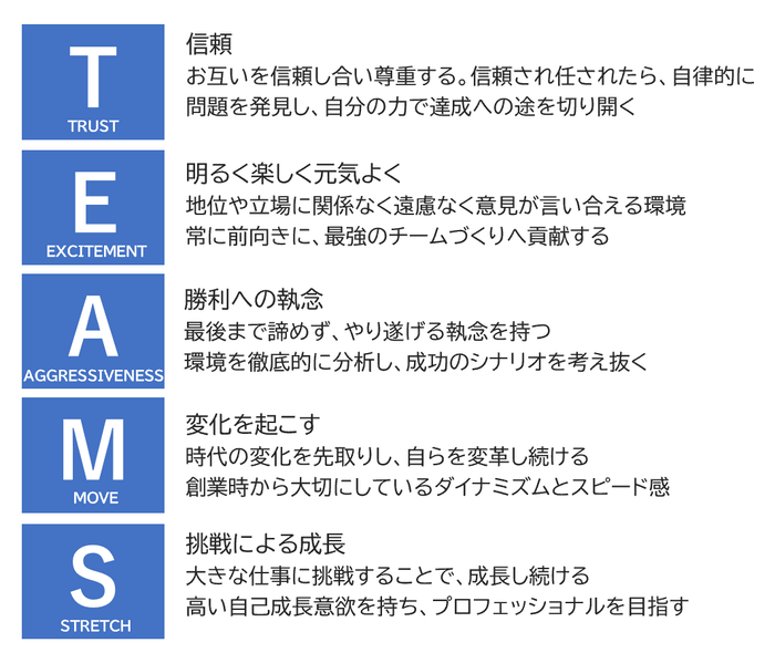 お互いを信頼し尊重すること、地位や立場に関係なく遠慮なく意見が言い合える環境をつくっていくこと、大きな仕事に挑戦し成長し続けることなど、一人ひとりを大切にしつつ、高いチームワークを実現することを目指しています。