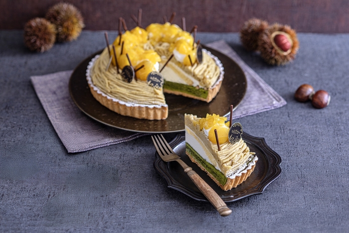 茨城県笠間市産の風味豊かな栗を使用したタルト。大納言あずき入りの抹茶ケークタルトにミルククリームとモンブランクリームをしぼり、栗の甘露煮を飾りました。