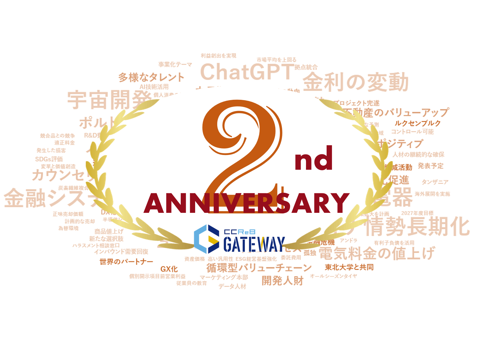 CCReB GATEWAYが開設2周年を迎えるにあたり、CCReB GATEWAYは日本にて特許を取得致しました(特許第7432980号)。現在は日本語での提供のみとしておりますが、海外ユーザーからの英語表示ニーズにも応えるべく、海外展開への第一弾として「ホットワード分析」の英語表示対応を近日予定しており、日本企業の経営動向を世界に発信することで日本企業と海外ユーザーの架け橋としての役割を担って参ります。