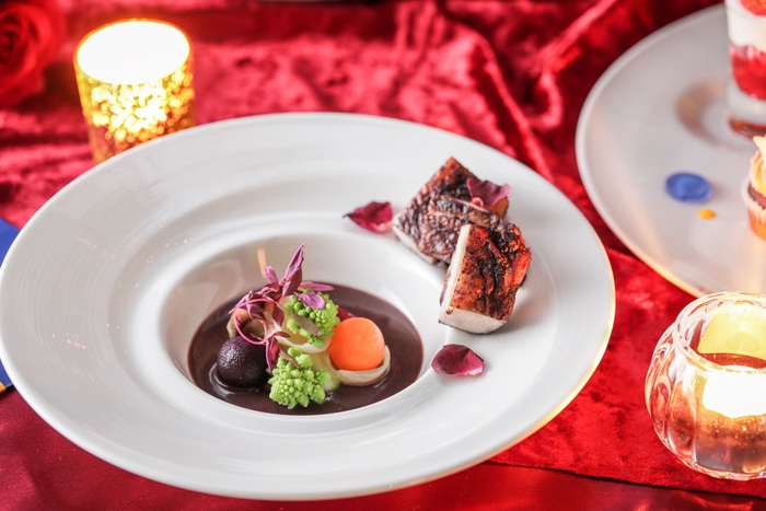 デザートプレートは“美女と野獣”の物語仕立てになっております。呪いをかけられ野獣となった王子を表現した「グリオットチェリーのチョコレートマフィン」、晩餐会の王子の姿を「オレンジとミルクチョコレートのオペラ」、晩餐会の為贈られた特別なドレスを「レアチーズケーキ」で仕上げました。前菜4種盛合せは「一輪のバラとさまざまな召使いたち」を表現いたしました。メイン料理は野獣とバラをイメージした「三河鶏モモ肉のロティ コック・オ・ヴァン スタイル」をご用意いたしまた。また、クリスマス晩餐会に招かれたようなゴージャスな会場は、キャンドルや薔薇などの装飾を施し、“美女と野獣”の世界観を表現いたします。聖なるに夜にロマンチックで記憶に残る特別な時間をお過ごしいただけます。