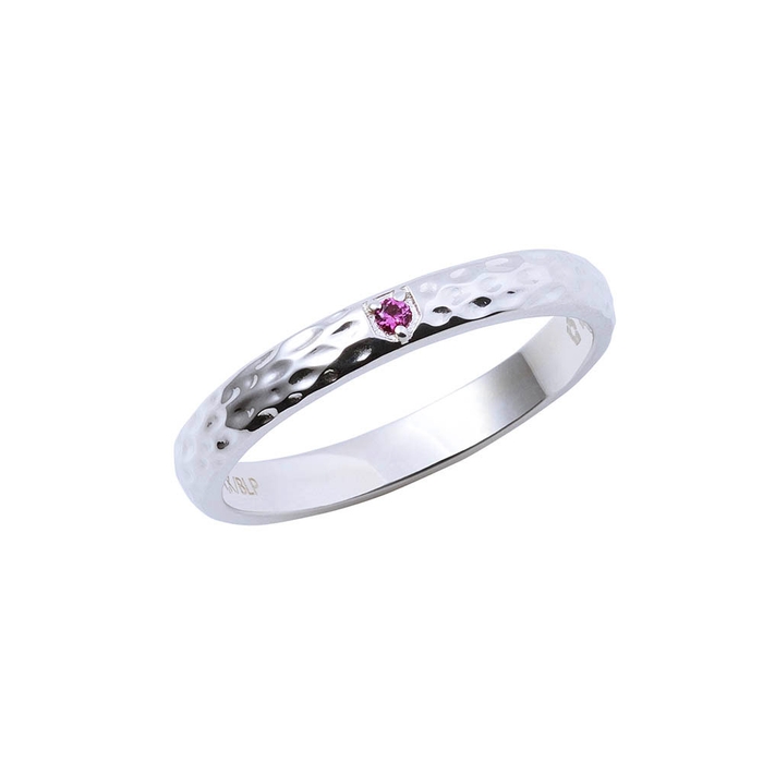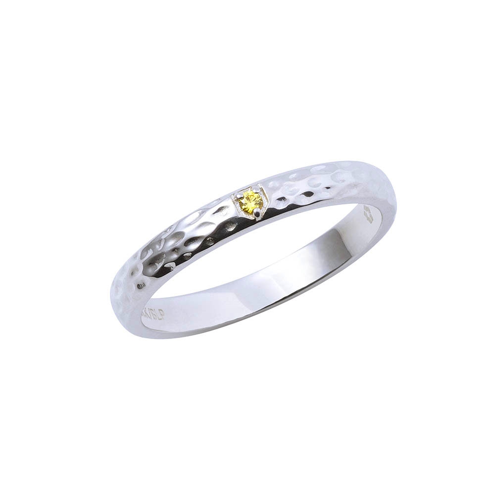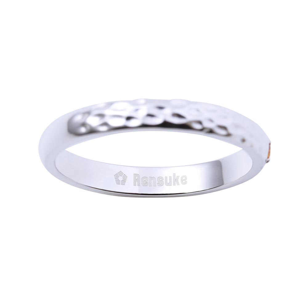 甲丸リングに槌目加工を施し、イメージカラーストーンをセット。作品の世界観をデザインに取り込みました。